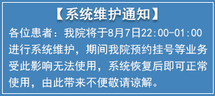 各位患者:我院将于8月7日22:00-01:00进行系统维护,期间我院预约挂号等业…
